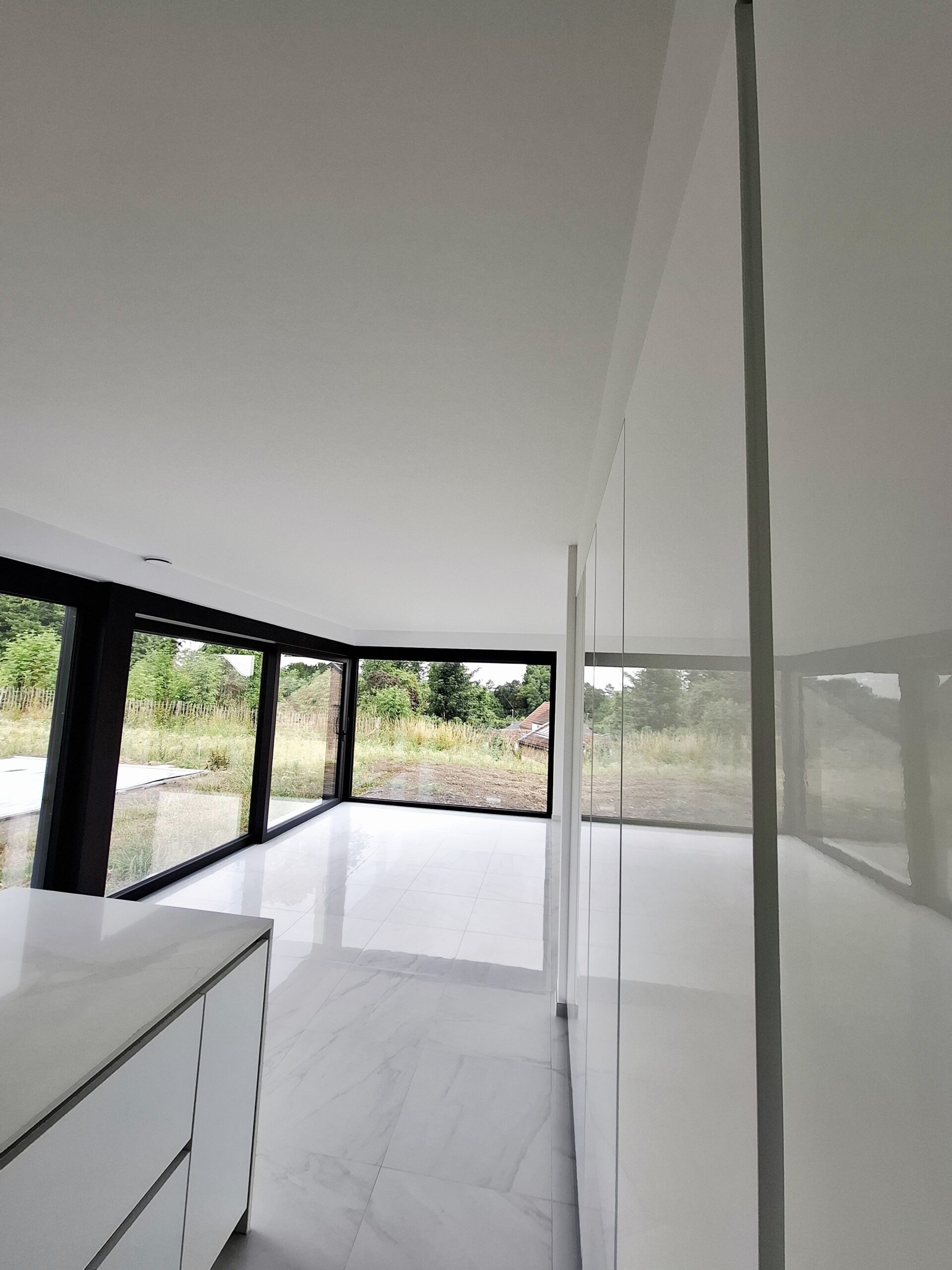 Ici, les châssis PVC noir mat s’accordent parfaitement avec l’éclat d’un carrelage blanc immaculé, créant un contraste moderne et raffiné. Ce mariage subtil des matériaux et des teintes apporte à l’habitation une allure à la fois élégante et intemporelle.