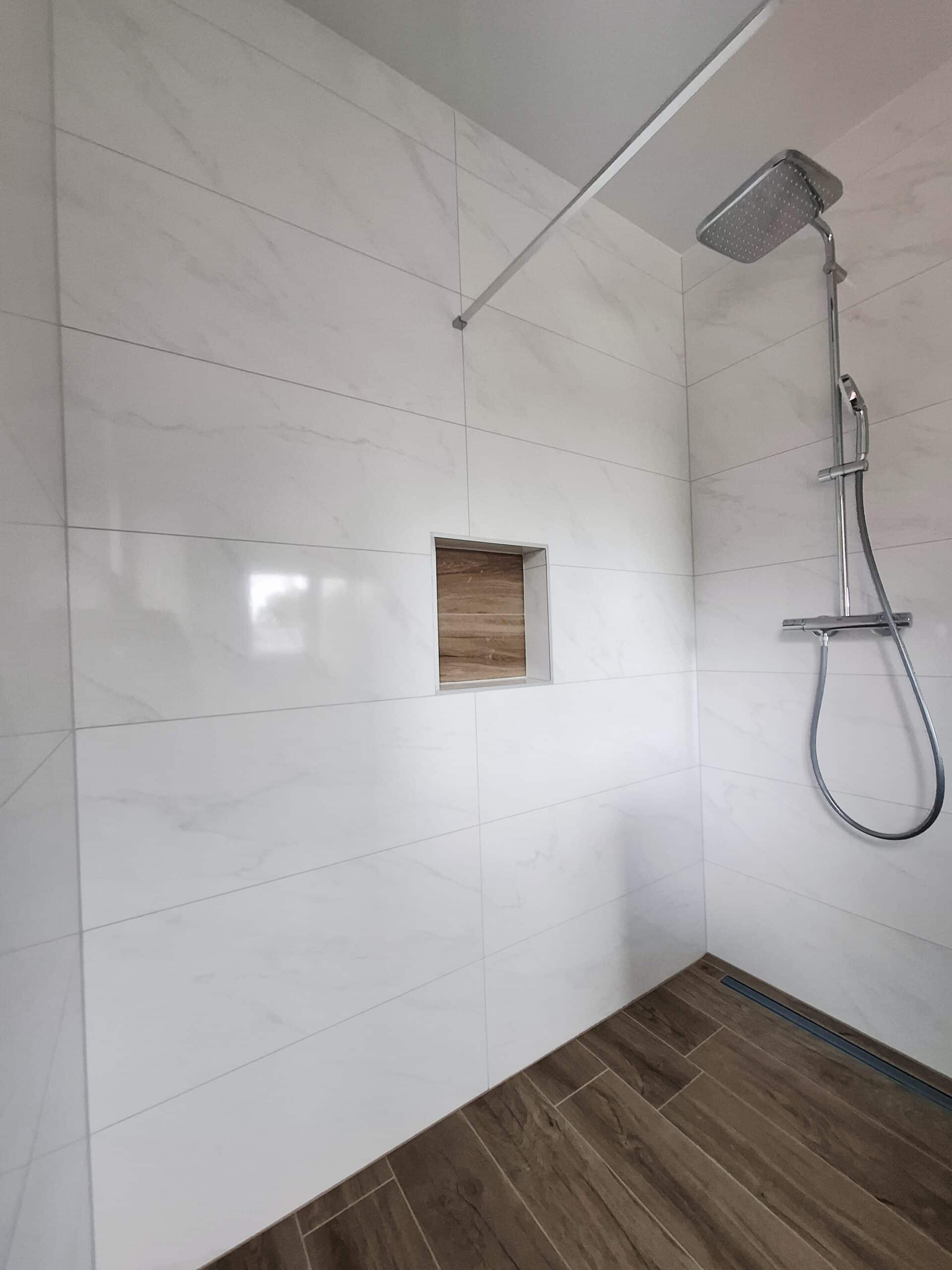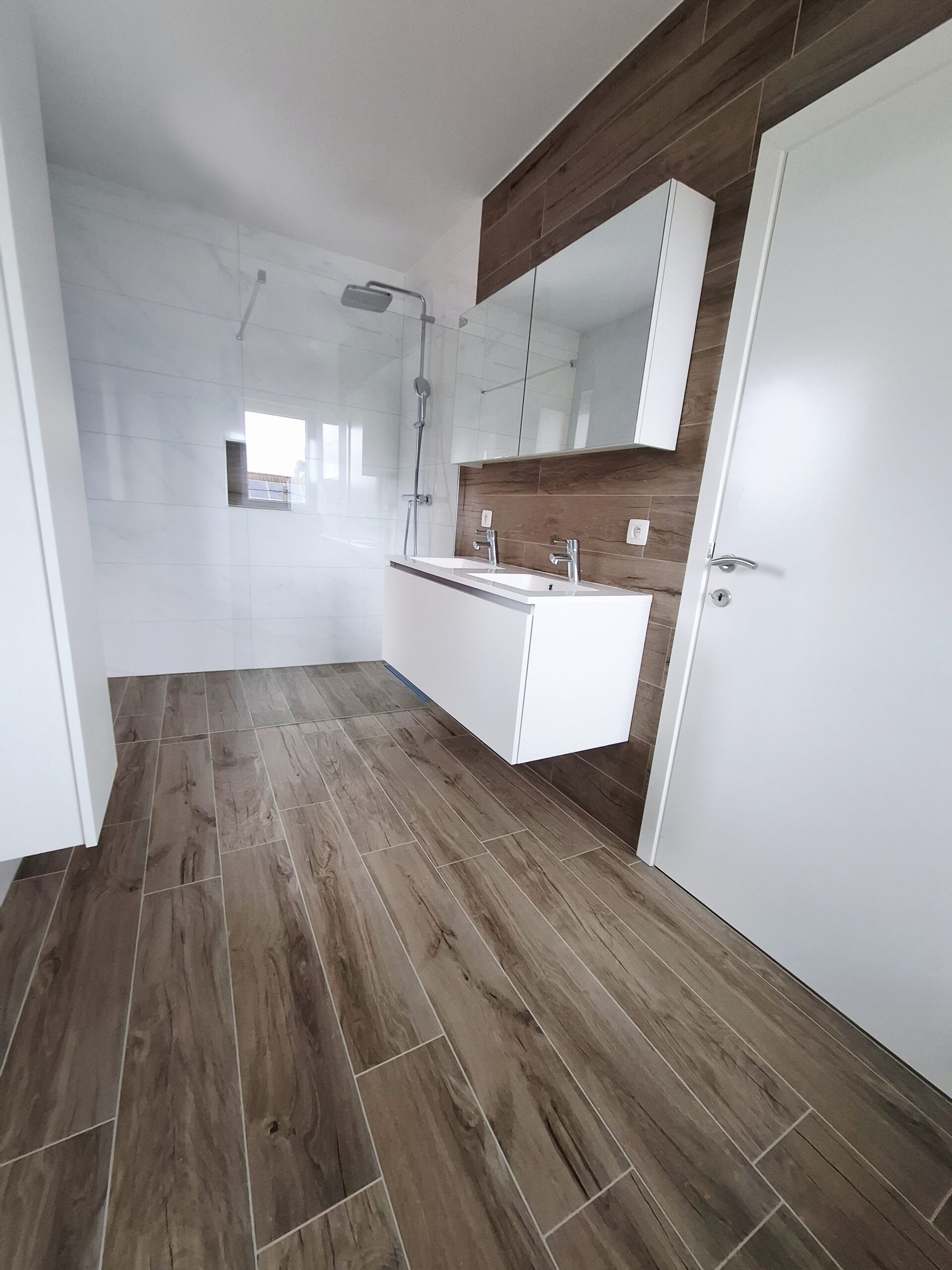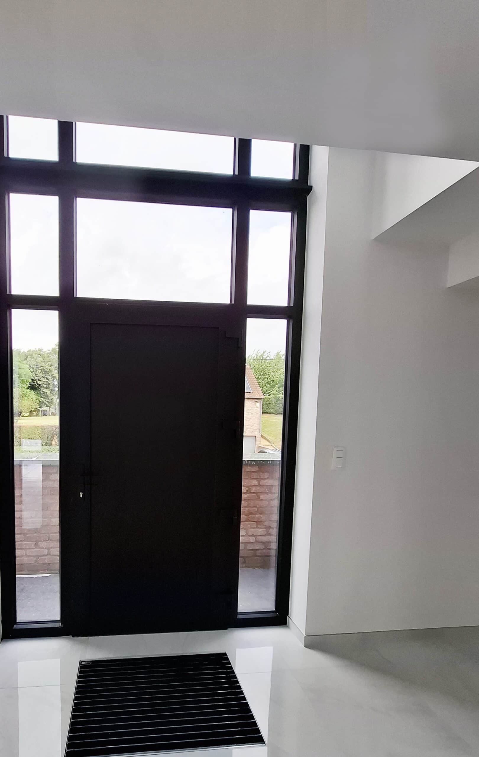 Ici, les châssis PVC noir mat s’accordent parfaitement avec l’éclat d’un carrelage blanc immaculé, créant un contraste moderne et raffiné. Ce mariage subtil des matériaux et des teintes apporte à l’habitation une allure à la fois élégante et intemporelle.