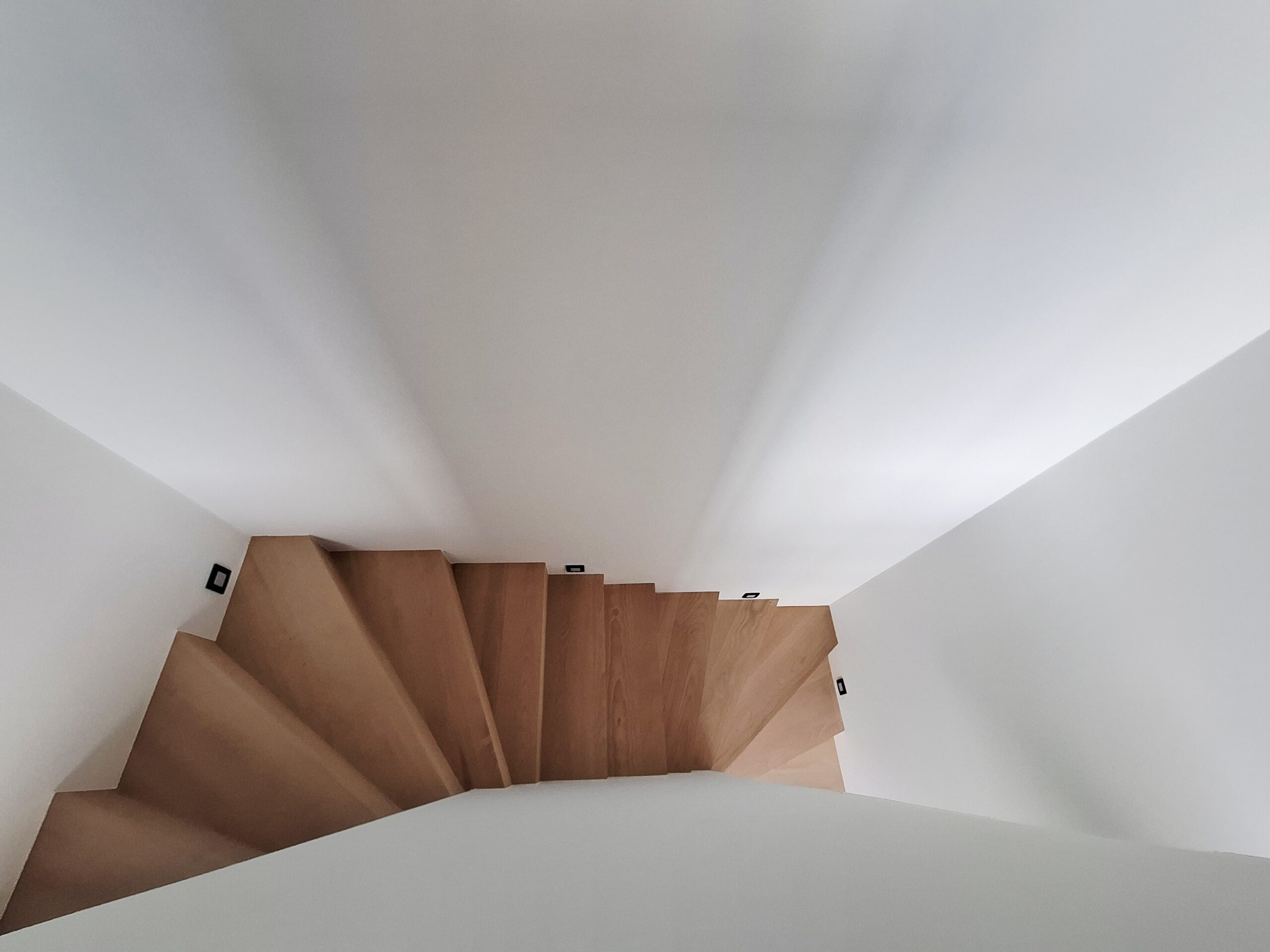 L’escalier en bois, quant à lui, vient adoucir l’ensemble en apportant une touche chaleureuse et naturelle qui équilibre le côté contemporain du projet.